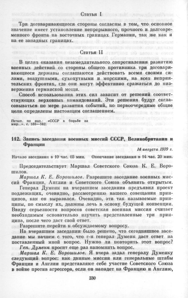 Запись заседания военных миссий СССР, Великобритании и Франции. 14 августа 1939 г. // Печат. по изд.: «СССР в борьбе за мир...», с. 563—572.