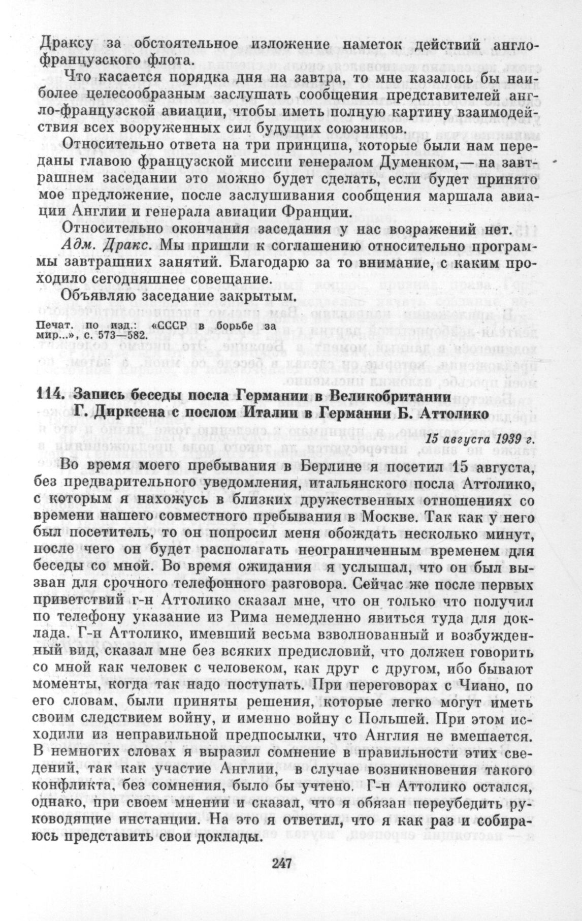Запись беседы посла Германии в Великобритании Г. Дирксена с послом Италии в Германии Б. Аттолико. 15 августа 1939 г. // Печат. по изд.: «Документы и материалы кануна второй мировой войны», т. II, с. 151—152.