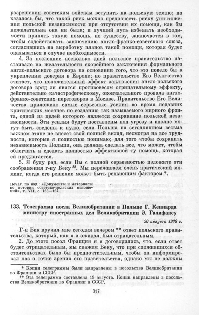 Телеграмма посла Великобритании в Польше Г. Кеннарда министру иностранных дел Великобритании Э. Галифаксу. 20 августа 1939 г. // Печат. по изд.: «Documents on British Foreign Policy. 1919—1939». Third Series, vol. VII, p. 85-86.