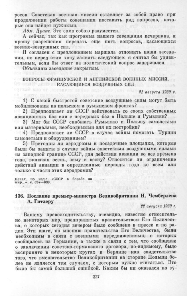 Послание премьер-министра Великобритании Н. Чемберлена А. Гитлеру. 22 августа 1939 г. // Печат. по изд.: «Documents on British Foreign Policy. 1919—1939». Third Series, vol. VII, p. 127-128.