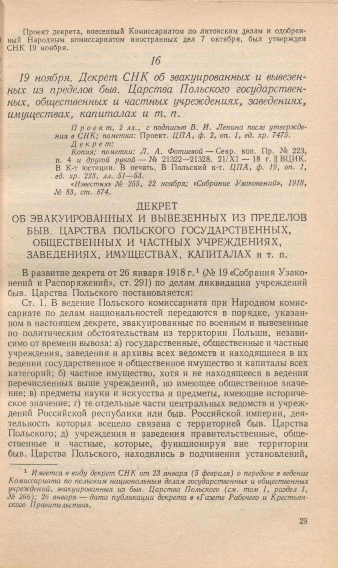 19 ноября. Декрет СНК об эвакуированных и вывезенных из пределов быв. Царства Польского государственных, общественных и частных учреждениях, заведениях, имуществах, капиталах и т. п. // Проект, 2 лл., с подписью В. И. Ленина после утверждения в СНК; пометка: Проект. ЦПА, ф. 2, oп. 1, ед. хр. 7475. Декрет: Копия; пометки: Л. А. Фотиевой — Секр. коп. Пр. № 223, п. 4 и другой рукой — № 21322—21328. 21/XI — 18 г. || ВЦИК. В К-т юстиции. В печать. В Польский к-т. ЦПА, ф. 19, oп. 1, ед. хр. 223, лл. 51—53. «Известия» № 255, 22 ноября; «Собрание Узаконений», 1918, № 83, cт. 874.