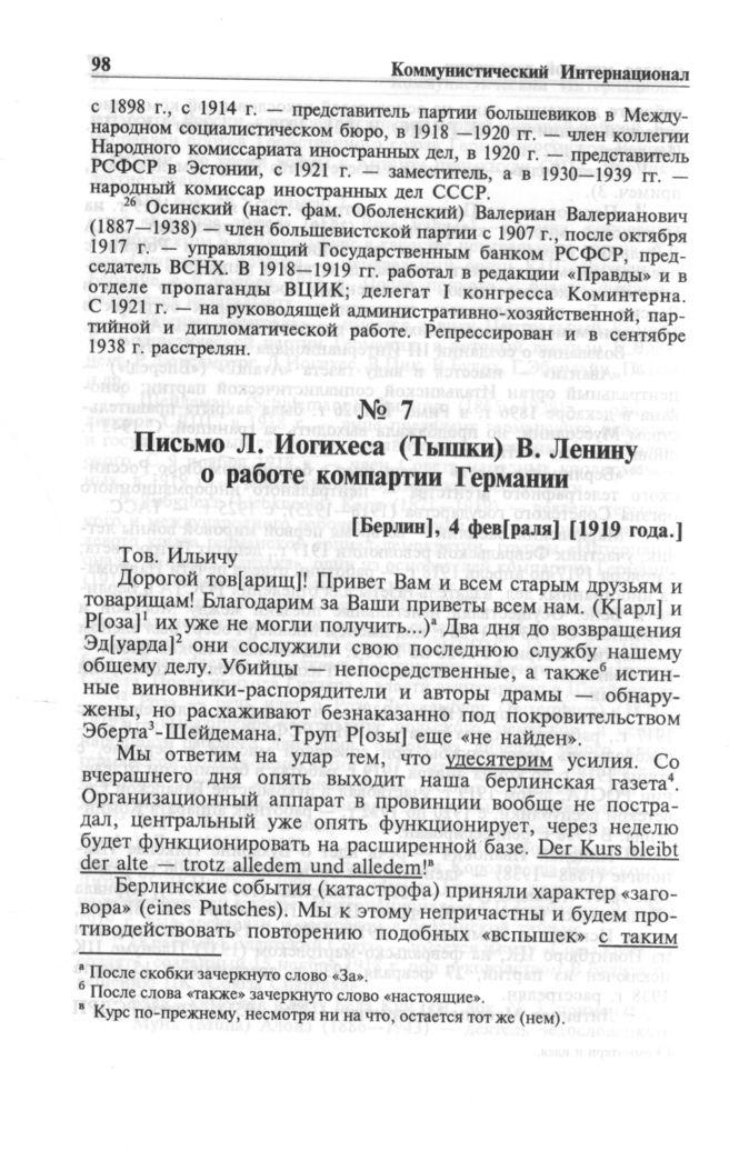 Письмо Л. Иогихеса (Тышки) В. Ленину о работе компартии Германии. [Берлин], 4 фев[раля] [1919 года.] // РЦХИДНИ, ф. 5, оп. 3, д. 267, л. 1-1 об. Подлинник, рукопись, русский язык с вставками на немецком и французском языках. Отрывок из письма с небольшими изменениями впервые опубликован Я. Ганецким в «Правде», № 68, 29 марта 1919 г., не полностью письмо опубликовано в книге: Письма В.И. Ленину из-за рубежа М. 1969, с. 117.