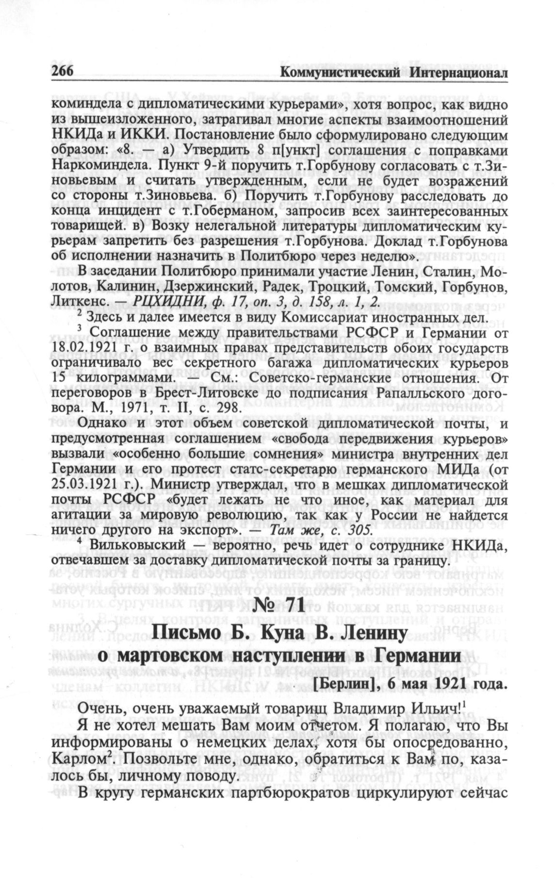 Письмо Б. Куна В. Ленину о мартовском наступлении в Германии. [Берлин], 6 мая 1921 года // РЦХИДНИ, ф. 2, оп. 1, д. 18730, л. 1-3. Подлинник, машинопись, немецкий язык.