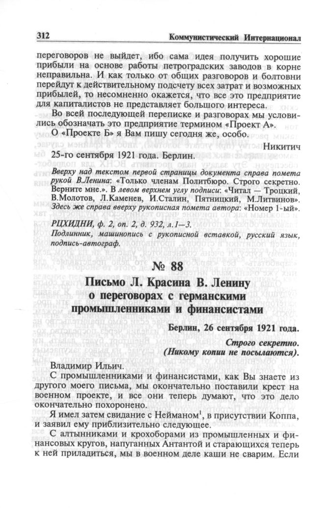 Письмо Л. Красина В. Ленину о переговорах с германскими промышленниками и финансистами. Берлин, 26 сентября 1921 года // РЦХИДНИ, ф. 2, оп. 2, д. 933, л. 1-9. Подлинник, машинопись с рукописной правкой, русский язык, подпись-автограф.