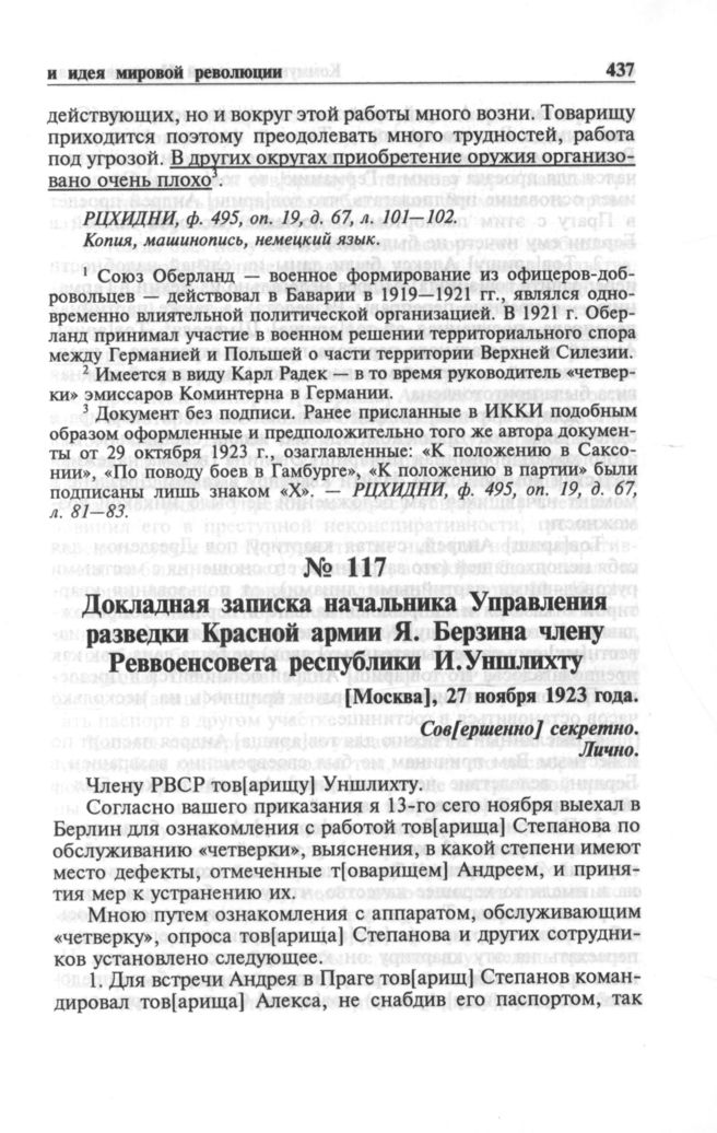 Докладная записка начальника Управления разведки Красной армии Я. Берзина члену Реввоенсовета республики И. Уншлихту. [Москва], 27 ноября 1923 года // РЦХИДНИ, ф. 495, оп. 19, д. 218, л. 83-90. Подлинник, машинопись, русский язык, подпись-автограф.