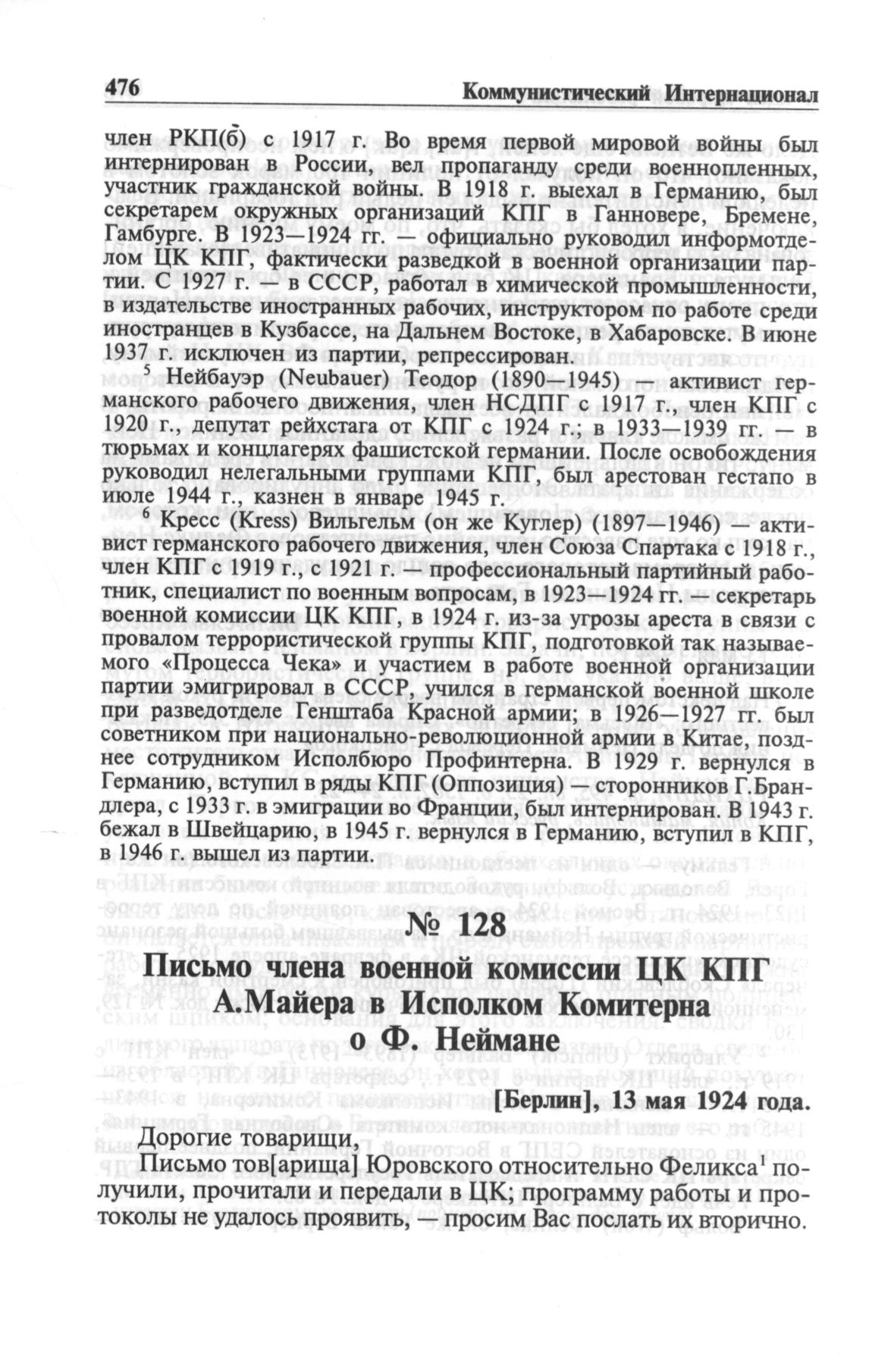 Письмо члена военной комиссии ЦК КПГ А. Майера в Исполком Комитерна о Ф. Неймане. [Берлин], 13 мая 1924 года // РЦХИДНИ, ф. 495, оп. 25, д. 1367, л. 28-31. Копия, машинопись, русский язык.