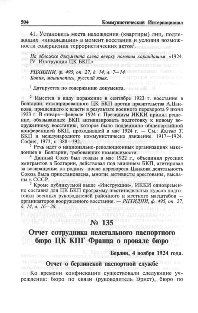 Отчет сотрудника нелегального паспортного бюро ЦК КПГ Франца о провале бюро. Берлин, 4 ноября 1924 года // РЦХИДНИ, ф. 495, оп. 27, д. 12, л. 15-16. Копия, машинопись, немецкий язык.