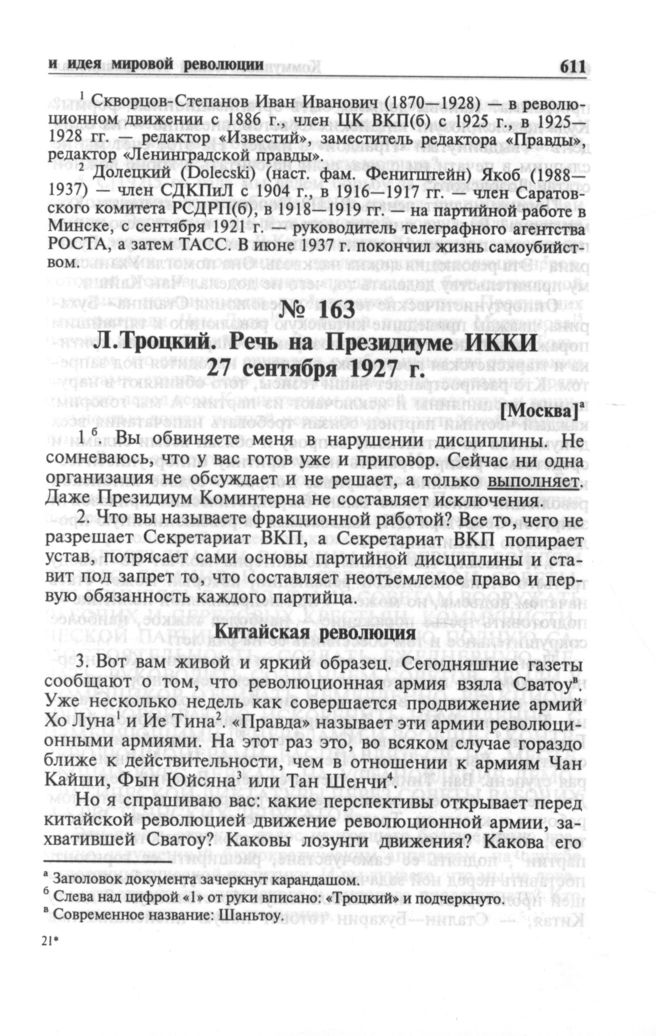 Л. Троцкий. Речь на Президиуме ИККИ 27 сентября 1927 г. [Москва] // РЦХИДНИ, ф. 495, оп. 2, д. 83, л. 32-45. Подлинник, машинопись с рукописной правкой опечаток, русский язык. Частично опубликовано в: «Отечественные архивы». М., 1992, № 1, с. 77-82.