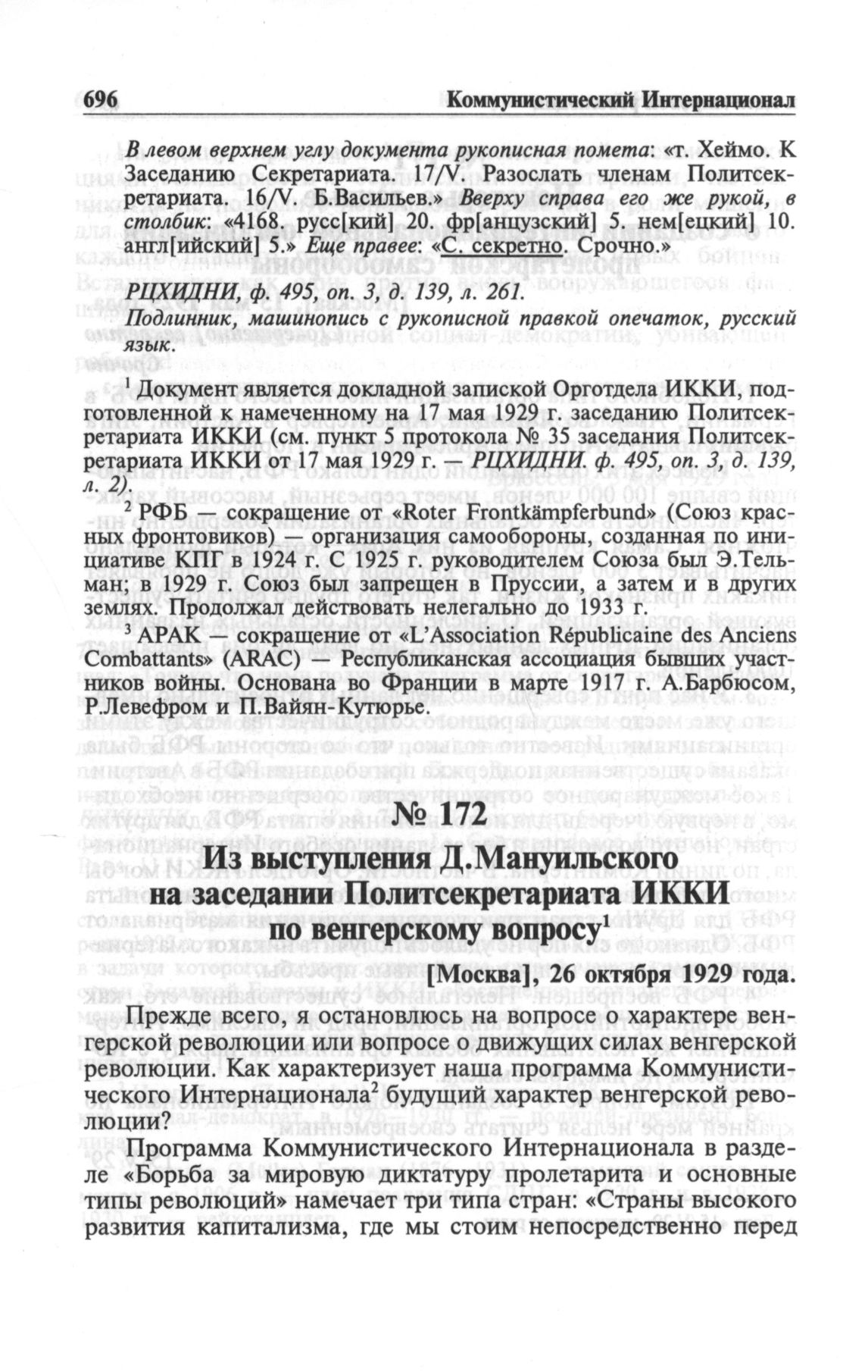 Из выступления Д. Мануильского на заседании Политсекретариата ИККИ по венгерскому вопросу. [Москва], 26 октября 1929 года // РЦХИДНИ, ф. 495, оп. 3, д. 170, л. 6-10. Подлинник, машинопись, русский язык.