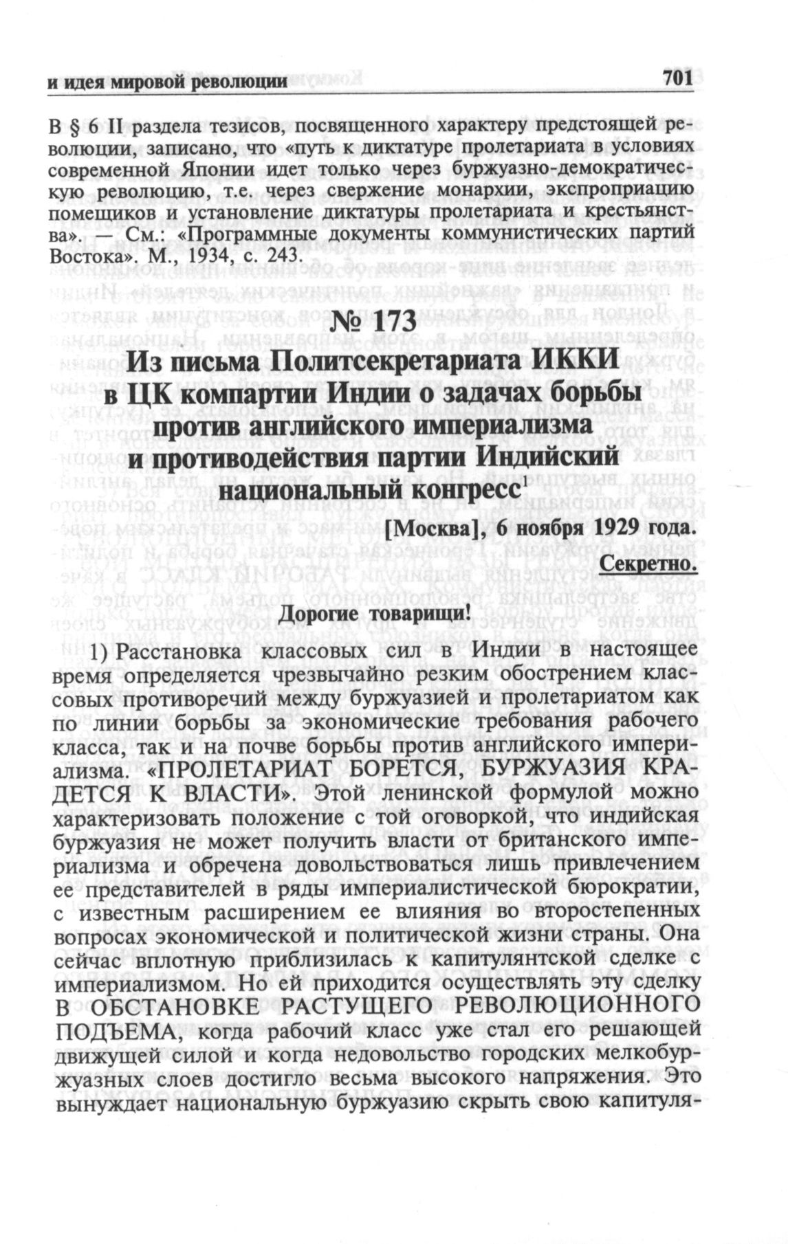 Из письма Политсекретариата ИККИ в ЦК компартии Индии о задачах борьбы против английского империализма и противодействия партии Индийский национальный конгресс. [Москва], 6 ноября 1929 года // РЦХИДНИ, ф. 495, оп. 3, д. 171, л. 28-32. Подлинник, машинопись с рукописной правкой, русский язык.