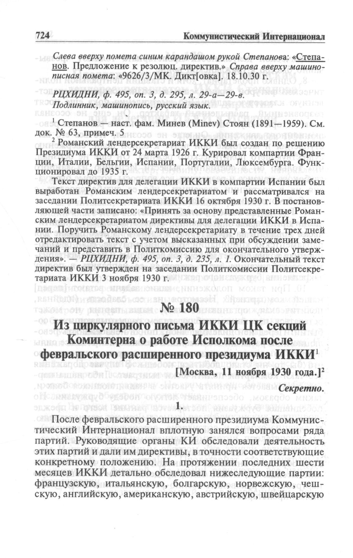 Из циркулярного письма ИККИ ЦК секций Коминтерна о работе Исполкома после февральского расширенного президиума ИККИ. [Москва, 11 ноября 1930 года.] // РЦХИДНИ, ф. 495, оп. 4, д. 67, л. 101-102. Подлинник, машинопись, русский язык.