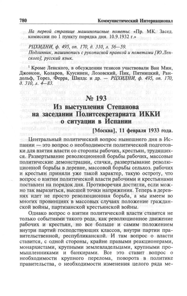 Из выступления Степанова на заседании Политсекретариата ИККИ о ситуации в Испании. [Москва], 11 февраля 1933 года // РЦХИДНИ, ф. 495, оп. 3, д. 360, л. 8-10, 34-35. Подлинник, машинопись, русский язык.