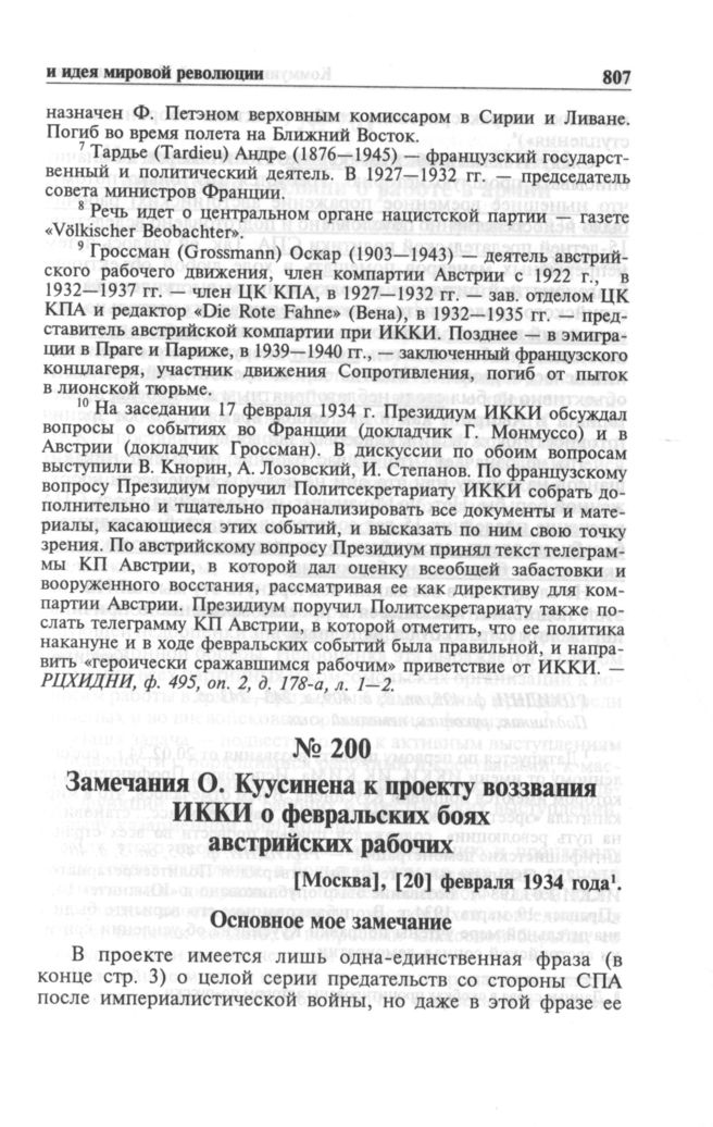Замечания О. Куусинена к проекту воззвания ИККИ о февральских боях австрийских рабочих. [Москва], [20] февраля 1934 года // РЦХИДНИ, ф. 495, оп. 3, д. 409, л. 243-243 об. Подлинник, рукопись, немецкий язык.