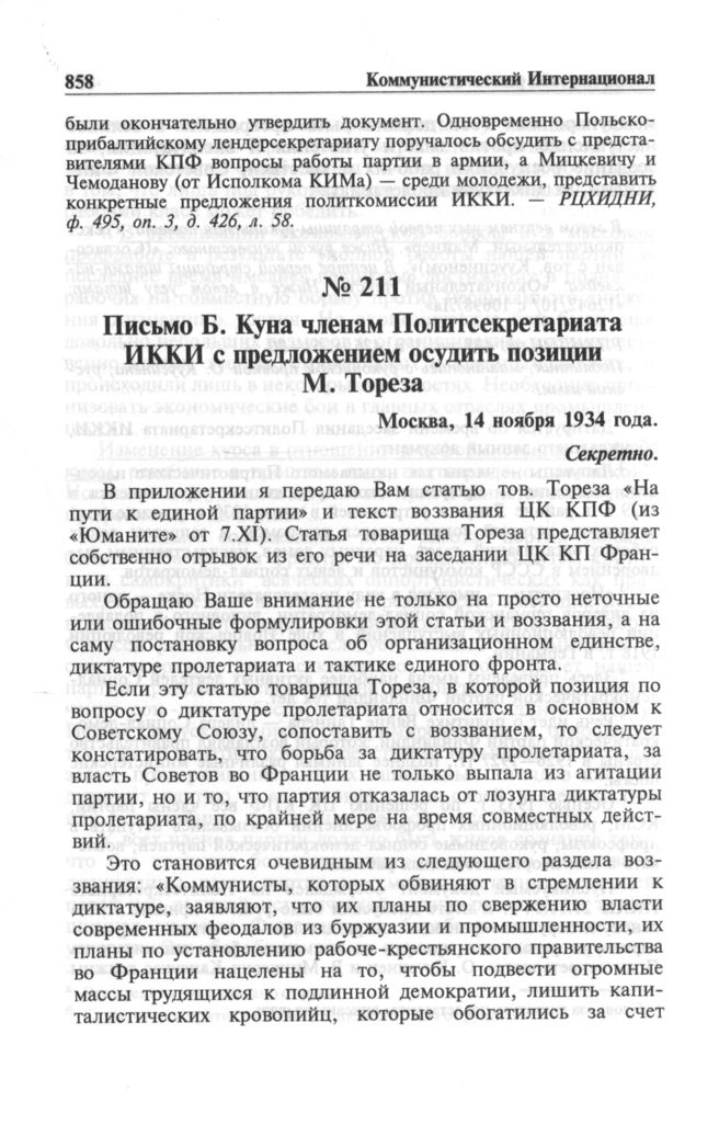 Письмо Б. Куна членам Политсекретариата ИККИ с предложением осудить позиции М. Тореза. Москва, 14 ноября 1934 года // РЦХИДНИ, ф. 517, оп. 1, д. 1683, л. 1-2. Копия, машинопись с рукописной правкой, немецкий язык.
