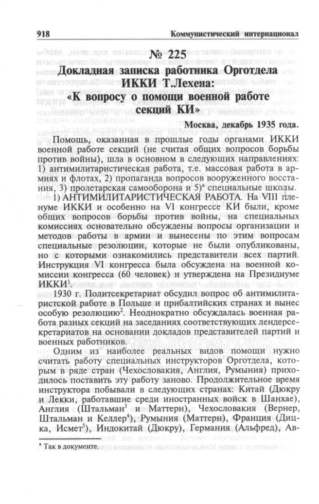 Докладная записка работника Орготдела ИККИ Т. Лехена: «К вопросу о помощи военной работе секций КИ». Москва, декабрь 1935 года // РЦХИДНИ, ф. 495, оп. 25, д. 1335, л. 126-130. Копия, машинопись, русский язык.