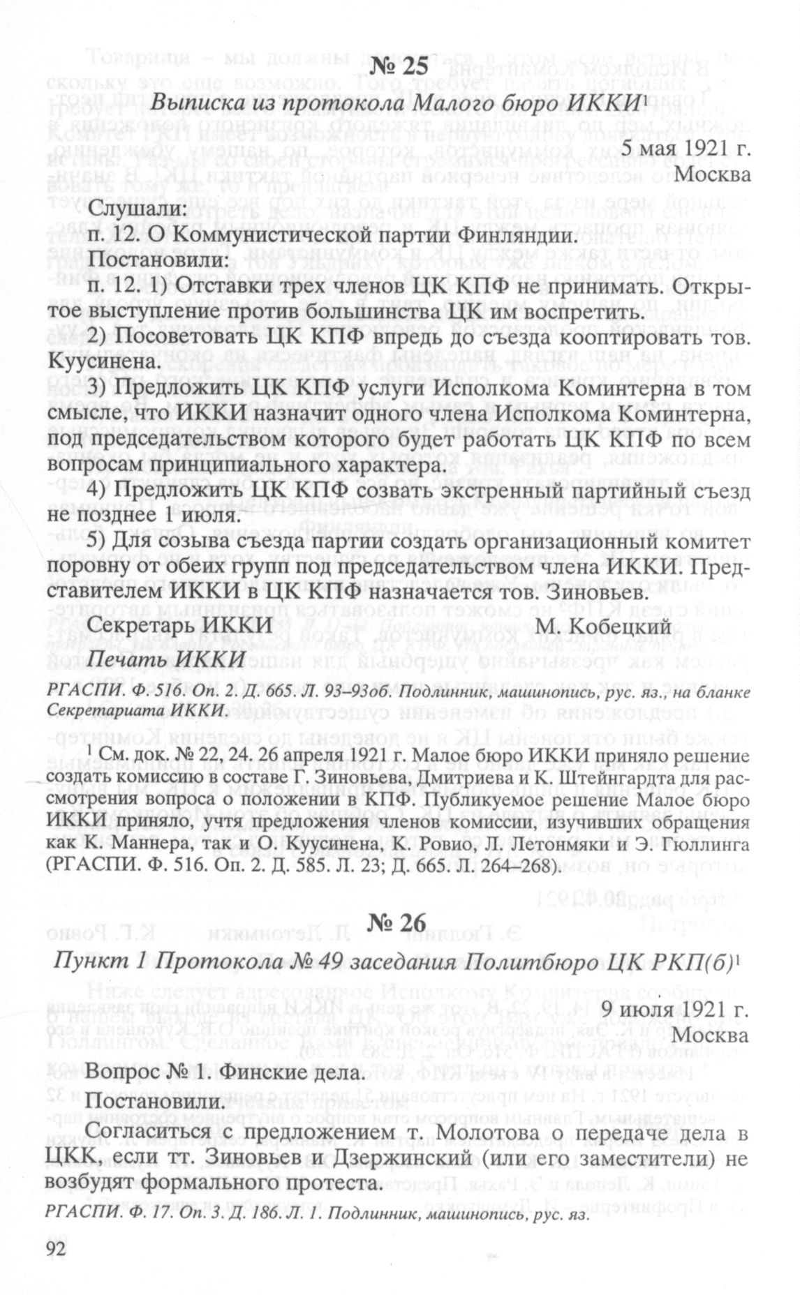 Пункт 1 Протокола № 49 заседания Политбюро ЦК РКП(б). 9 июля 1921 г. // РГАСПИ. Ф. 17. Oп. 3. Д. 186. Л. 1. Подлинник, машинопись, рус. яз.