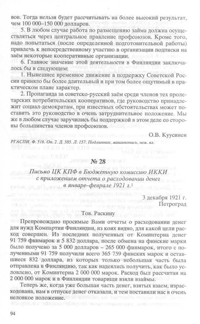 Письмо ЦК КПФ в Бюджетную комиссию ИККИ с приложением отчета о расходовании денег в январе-феврале 1921 г. 3 декабря 1921 г. // РГАСПИ . Ф. 516. Oп. 2. Д. 588. Л. 9-10. Копия, машинопись, рус. яз.