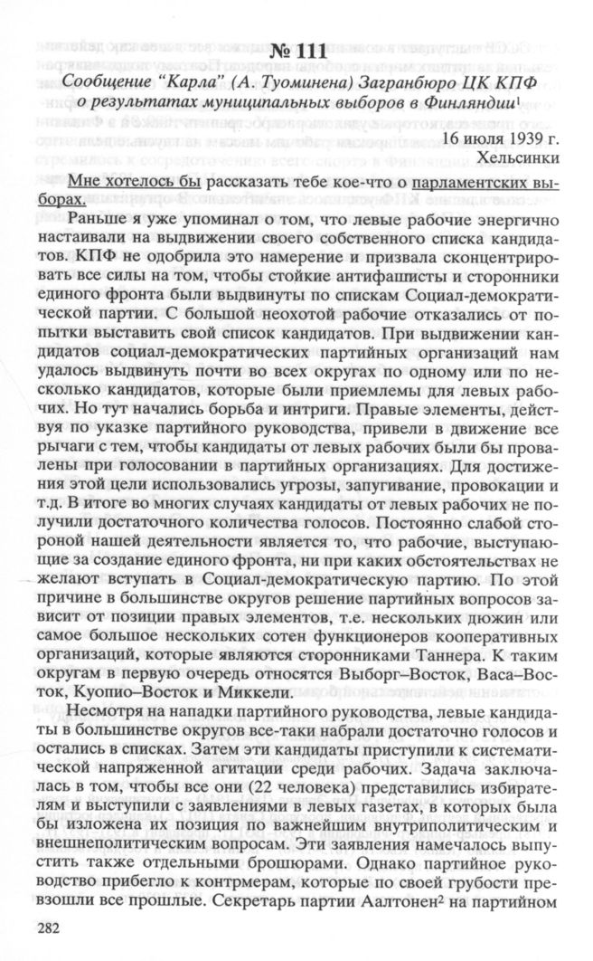 Сообщение “Карла” (А. Туоминена) Загранбюро ЦК КПФ о результатах муниципальных выборов в Финляндии. 16 июля 1939 г. // РГАСПИ. Ф. 495. Oп. 13. Д. 9. Л. 22-27. Копия, машинопись, нем. яз.