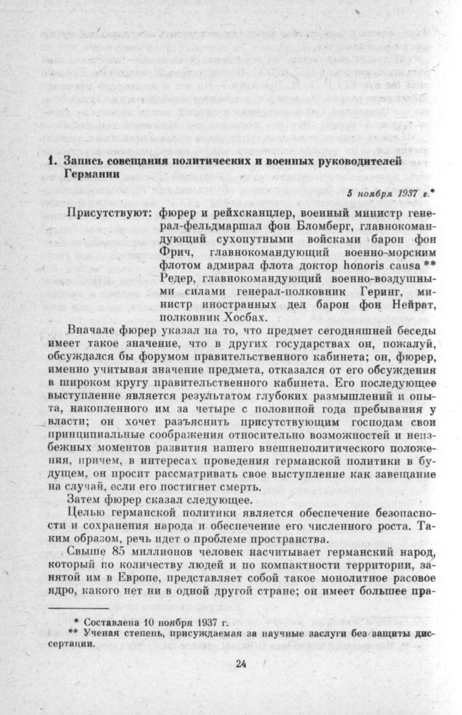 Запись совещания политических и военных руководителей Германии. 5 ноября 1937 г. // Печат. по изд.; «Совершенно секретно, только для командования». М., 1967, с. 52—62.