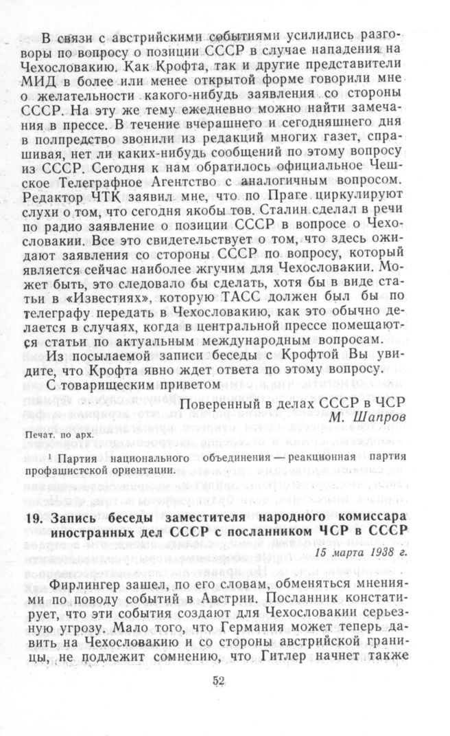 Запись беседы заместителя народного комиссара иностранных дел СССР с посланником ЧСР в СССР. 15 марта 1938 г. // Новые документы из истории Мюнхена. М., 1958. с. 15-17.