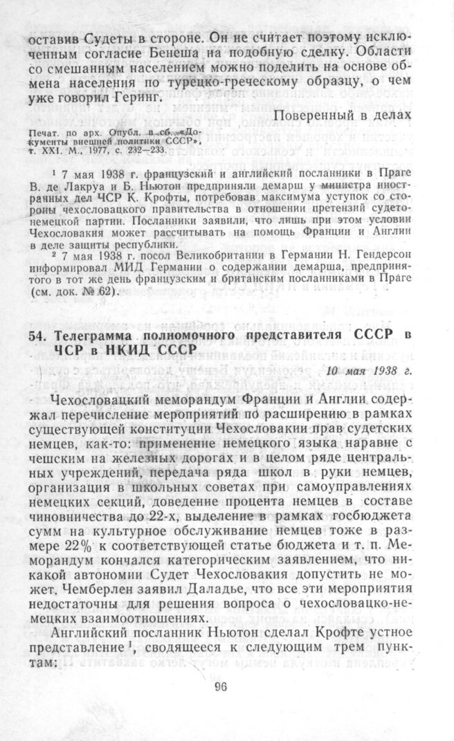 Телеграмма полномочного представителя СССР в ЧСР в НКИД СССР. 10 мая 1938 г. // Документы внешней политики СССР, т. XXI. М., 1977, с. 242-243.