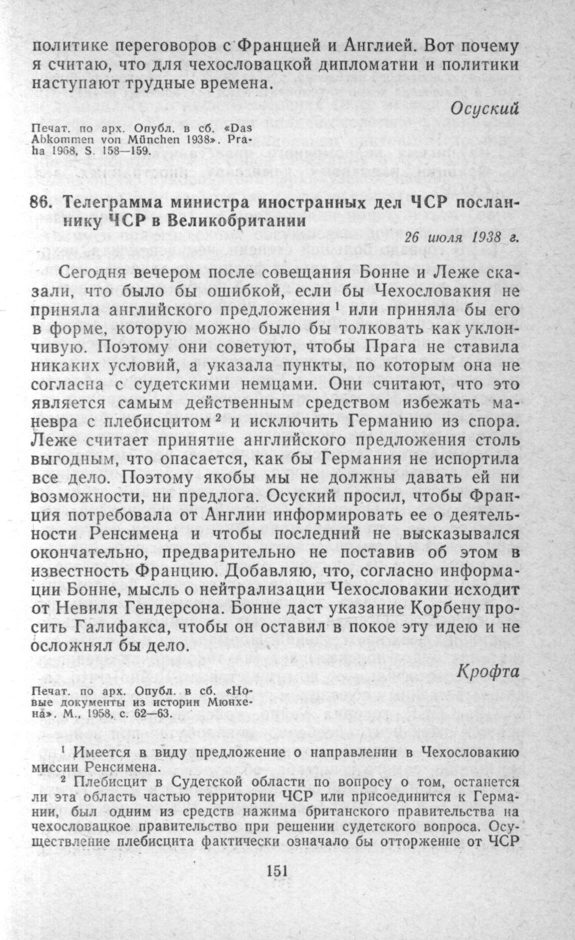 Телеграмма министра иностранных дел ЧСР посланнику ЧСР в Великобритании. 26 июля 1938 г. // Новые документы из истории Мюнхена. М., 1958, с. 62-63.