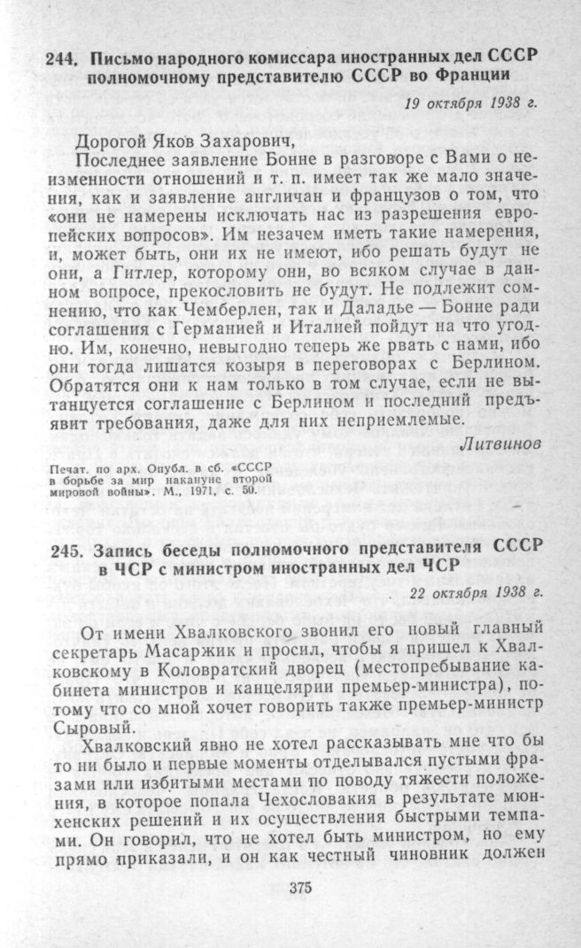 Запись беседы полномочного представителя СССР в ЧСР с министром иностранных дел ЧСР. 22 октября 1938 г. // Документы и материалы по истории советско-чехословацких отношений, т. 3. М., 1978, с. 578-581.