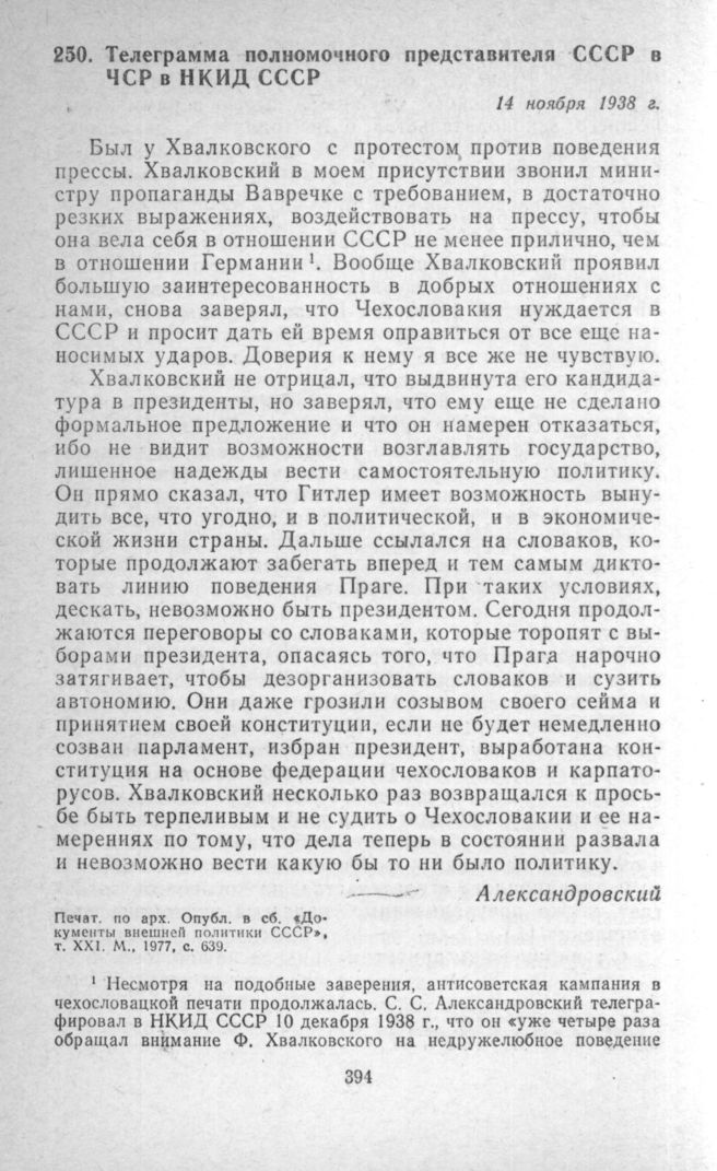 Телеграмма полномочного представителя СССР в ЧСР в НКИД СССР. 14 ноября 1938 г. // Документы внешней политики СССР, т. XXI. М., 1977, с. 63.