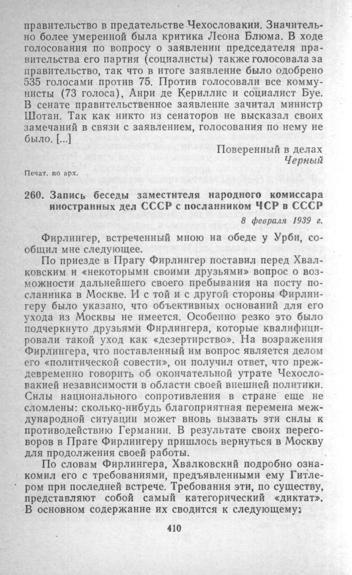 Запись беседы заместителя народного комиссара иностранных дел СССР с посланником ЧСР в СССР. 8 февраля 1939 г. // Печат. по арх.