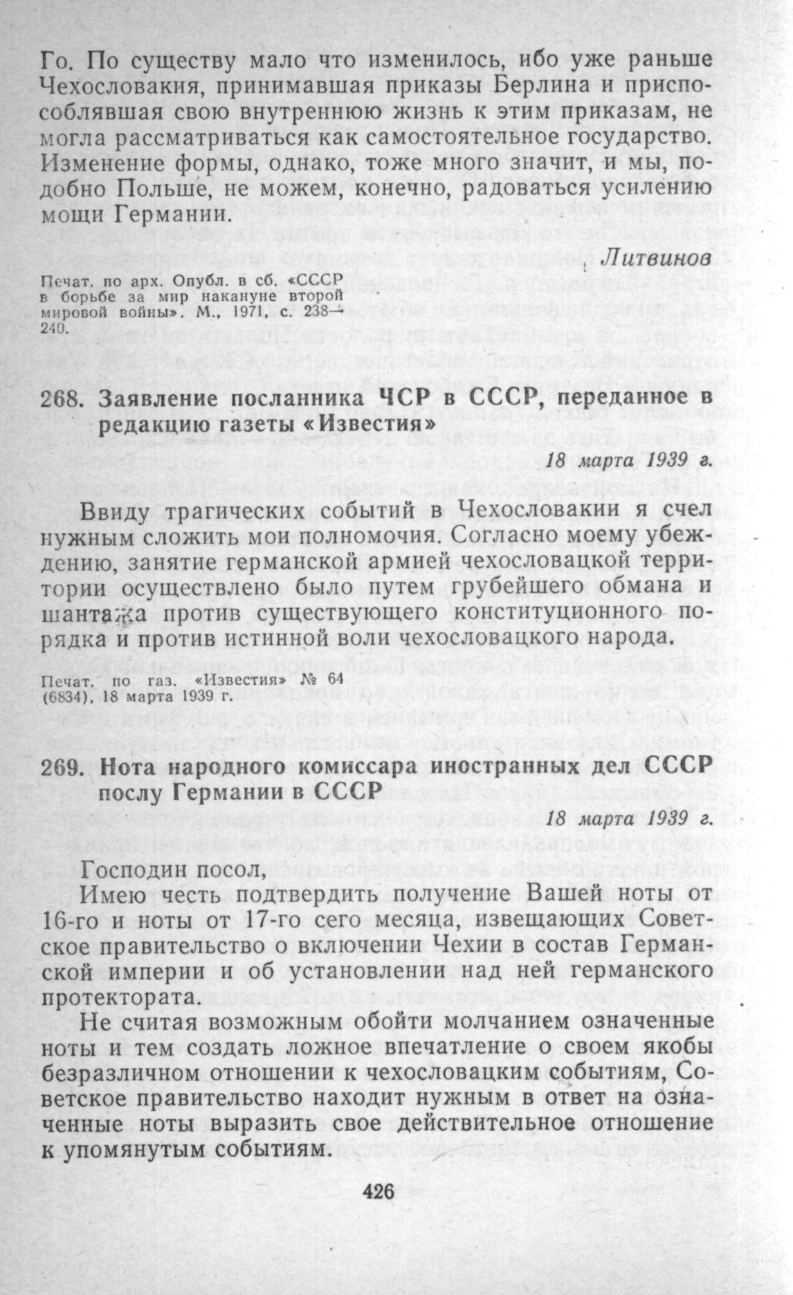 Нота народного комиссара иностранных дел СССР послу Германии в СССР. 18 марта 1939 г. // Известия № 66 (6836), 20 марта 1939 г.