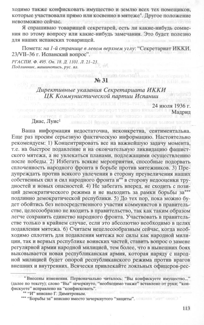 Директивные указания Секретариата ИККИ ЦК Коммунистической партии Испании. 24 июля 1936 г. Мадрид // РГАСПИ. Ф. 495. Оп. 74. Д. 201. Л. 3. Подлинник, машинопись, рус. яз.