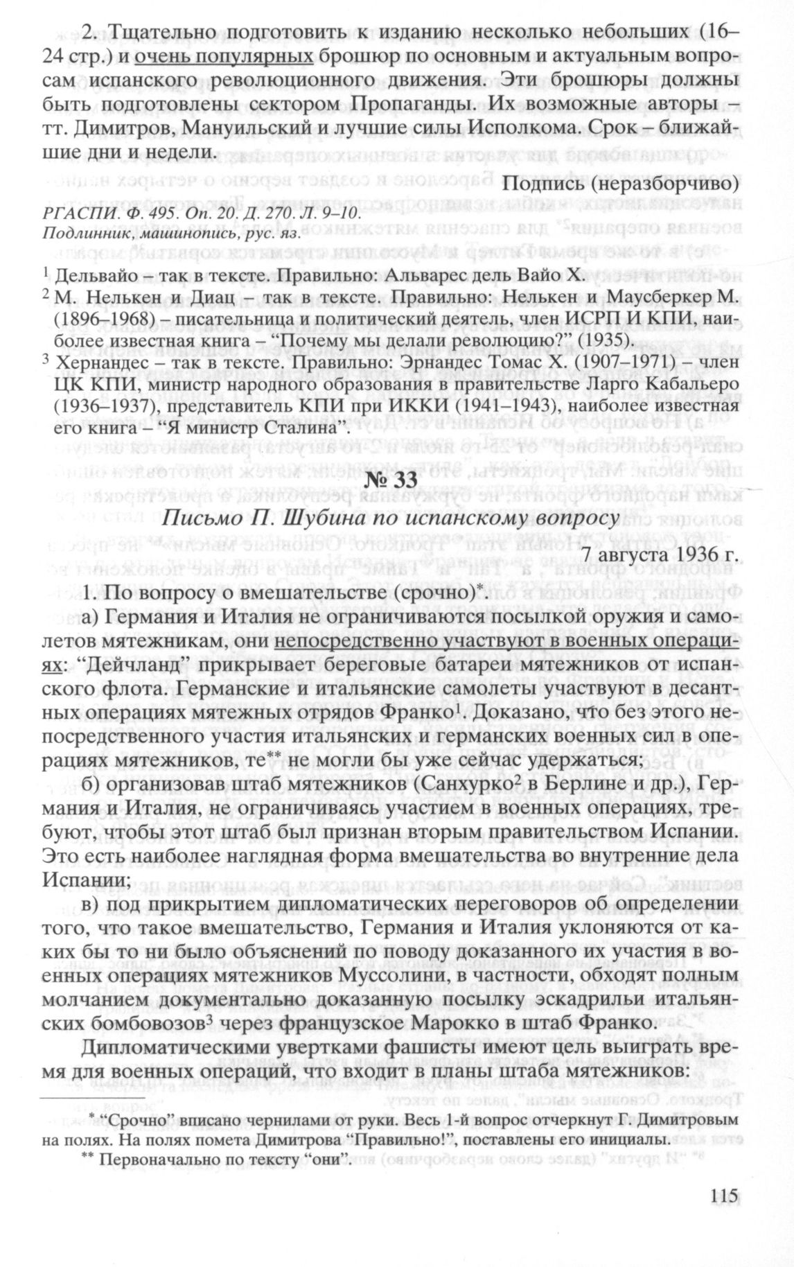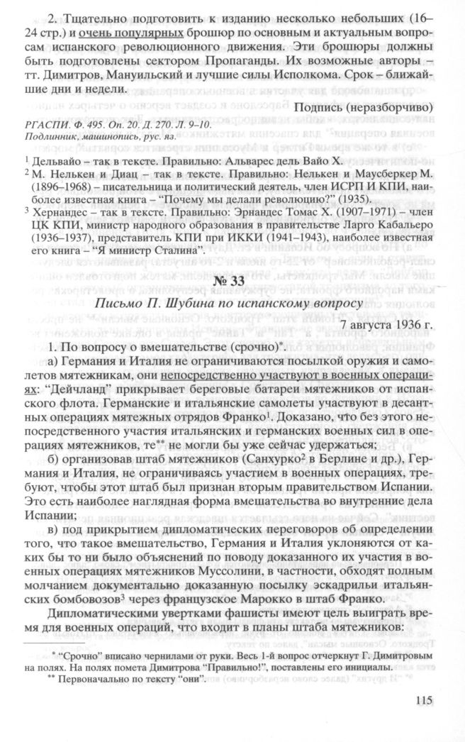 Письмо П. Шубина по испанскому вопросу. 7 августа 1936 г.