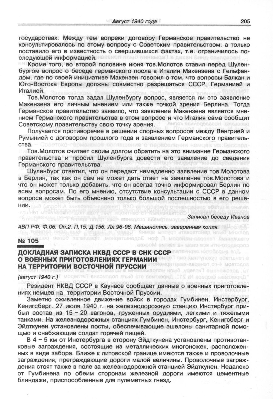 Докладная записка НКВД СССР в СНК СССР о военных приготовлениях Германии на территории Восточной Пруссии. [август 1940 г.] // ЦА СВР РФ. Д. 21616. Т. 1. Лл. 54-55. Машинопись на типографском бланке. Незаверенная копия.