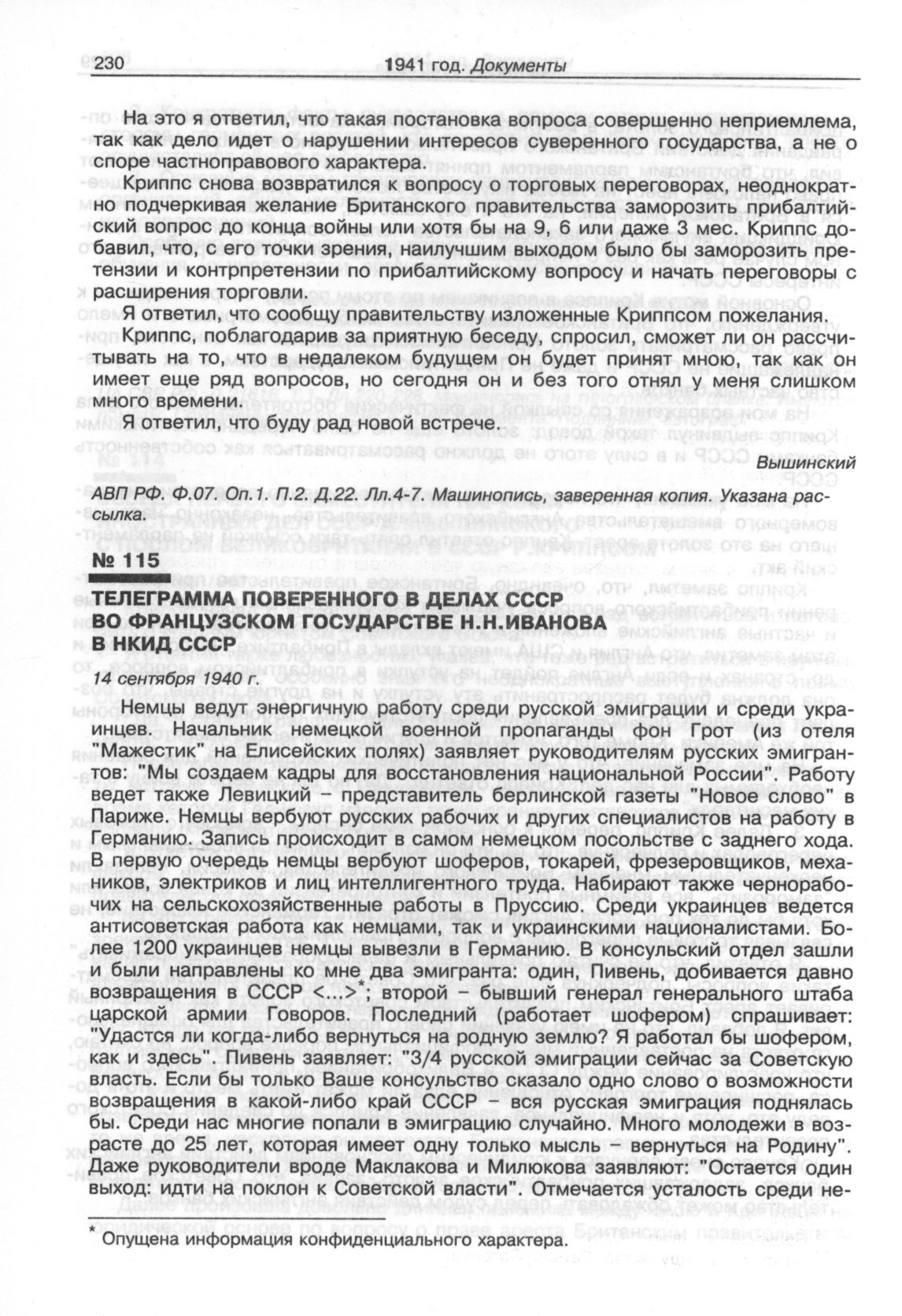 Телеграмма поверенного в делах СССР во Французском государстве Н.Н.Иванова в НКИД СССР. 14 сентября 1940 г. // АВП РФ. Ф. 059. Оп. 1. П. 328. Д. 2253. Лл. 100-101. Машинопись, заверенная копия.