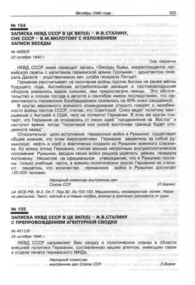 Записка НКВД СССР в ЦК ВКП(б) - И.В.Сталину с препровождением агентурной сводки. 24 октября 1940 г. // АП РФ. Ф. З. Оп. 64. Д. 675. Лл. 13-15. Машинопись на бланке НКВД СССР. Подлинник, автограф.