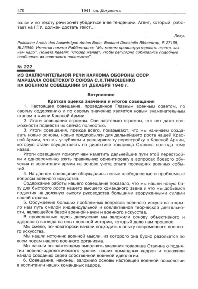 Из заключительной речи наркома обороны СССР Маршала Советского Союза С.К.Тимошенко на военном совещании 31 декабря 1940 г. // Опубликовано в сборнике "Накануне войны. Материалы совещания высшего руководящего состава РККА. 23-31 декабря 1940 г.". Издательство "ТЕРРА", 1993, с. 338-373.