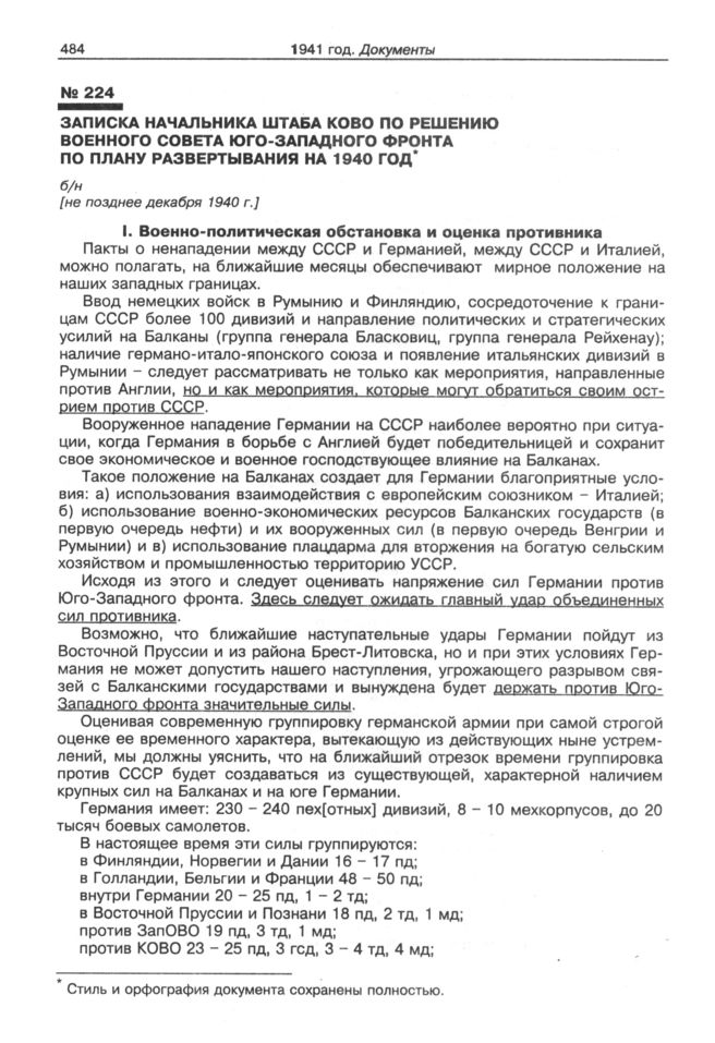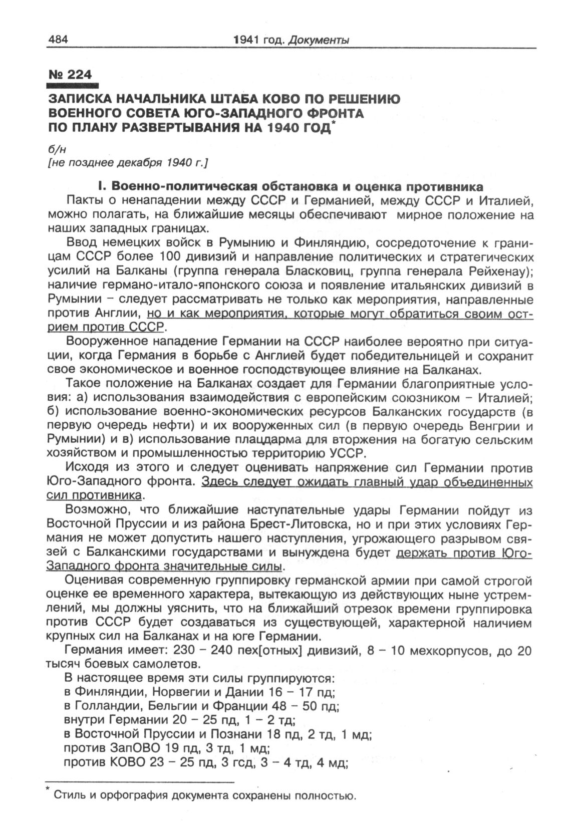 Записка начальника штаба КОВО по решению военного совета Юго-Западного фронта по плану развертывания на 1940 год. [Не позднее декабря 1940 г.] // ЦА МО РФ. Ф. 16. Оп. 2951. Д. 239. Лл. 245-277. Рукопись, оригинал, автограф.