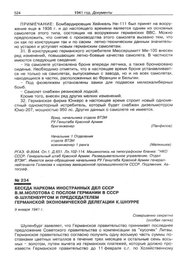 Беседа наркома иностранных дел СССР В.М.Молотова с послом Германии в СССР Ф.Шуленбургом и председателем германской экономической делегации К.Шнурре. 9 января 1941 г. // АВП РФ. Ф. 06. Оп. З. П. 1. Д. 4. Лл. 29-30. Машинопись, заверенная копия.