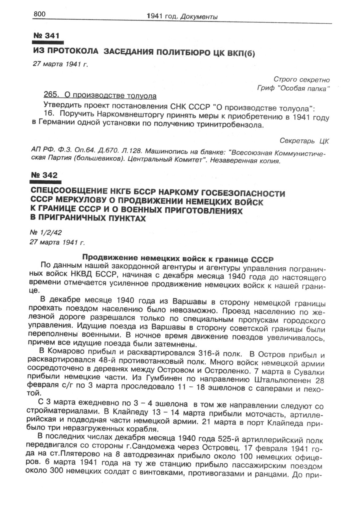 Спецсообщение НКГБ БССР наркому госбезопасности СССР Меркулову о продвижении немецких войск к границе СССР и о военных приготовлениях в приграничных пунктах. 27 марта 1941 г. // ЦА СВР РФ. Д. 21616. Т. 4. Лл. 1-10. Машинопись, подлинник, автограф.