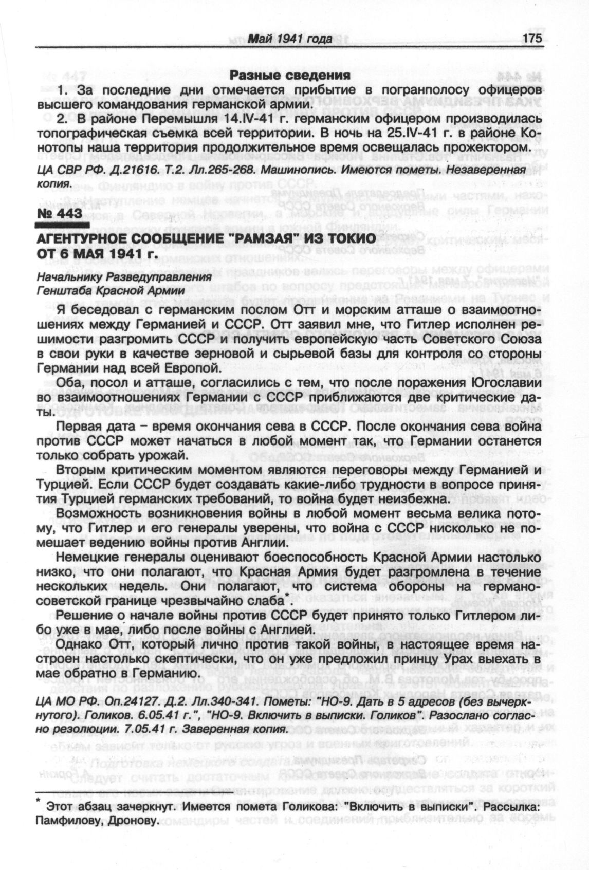 Агентурное сообщение "Рамзая" из Токио от 6 мая 1941 г. // ЦА МО РФ. Оп. 24127. Д. 2. Лл. 340-341. Заверенная копия.