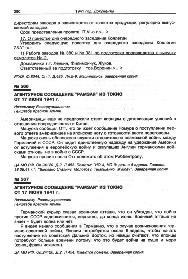 Агентурное сообщение "Рамзая" из Токио от 17 июня 1941 г. // ЦА МО РФ. Оп. 24120. Д. 2. Л. 453. Заверенная копия.