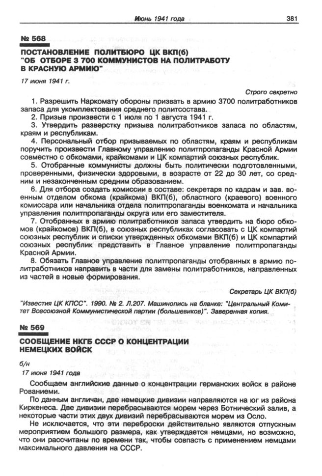 Постановление Политбюро ЦК ВКП(б) "Об отборе 3 700 коммунистов на политработу в Красную Армию". 17 июня 1941 г. // "Известия ЦК КПСС". 1990. № 2. Л. 207. Машинопись на бланке: "Центральный Комитет Всесоюзной Коммунистической партии (большевиков)". Заверенная копия.