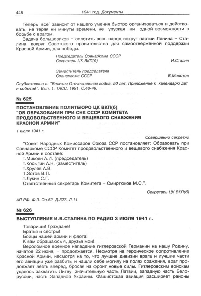 Выступление И.В.Сталина по радио 3 июля 1941 г. // Опубликовано в "И.В.Сталин. О Великой Отечественной войне Советского Союза", стр. 9-16. Изд. 1946.
