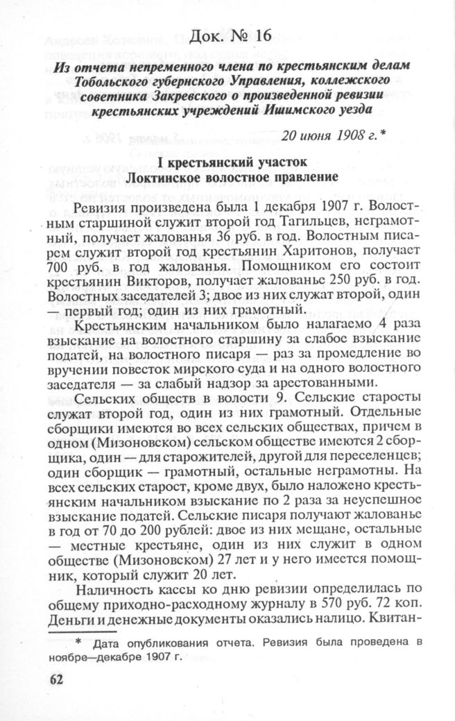 Из отчета непременного члена по крестьянским делам Тобольского губернского Управления, коллежского советника Закревского о произведенной ревизии крестьянских учреждений Ишимского уезда. 20 июня 1908 г. // ТФ ГАТО. Ф. 344. Oп. 1. Д. 2. Л. 289, 291, 296-296 об., 301, 307 об. Копия. Типограф, экз.