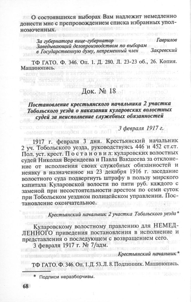 Постановление крестьянского начальника 2 участка Тобольского уезда о наказании куларовских волостных судей за неисполнение служебных обязанностей. 3 февраля 1917 г. // ТФ ГАТО. Ф. 346. Oп. 1. Д. 53.Л. 8. Подлинник. Машинопись.