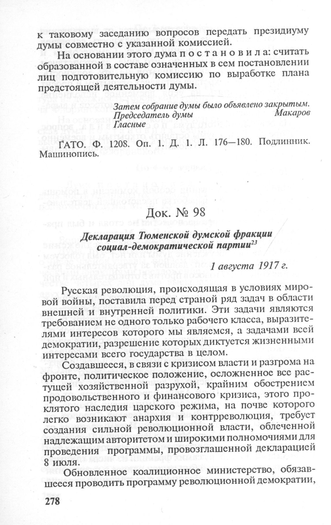 Декларация Тюменской думской фракции социал-демократической партии. 1 августа 1917 г. // ГАТО. Ф. 1208. Оп. 1. Д. 1. Л. 192—193 об. Заверенная копия. Машинопись.