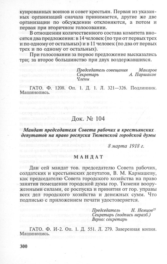 Мандат председателя Совета рабочих и крестьянских депутатов на право роспуска Тюменской городской думы. 8 марта 1918 г. // ГАТО. Ф. И-2. Oп. 1. Д. 551. Л. 279. Заверенная копия. Машинопись.