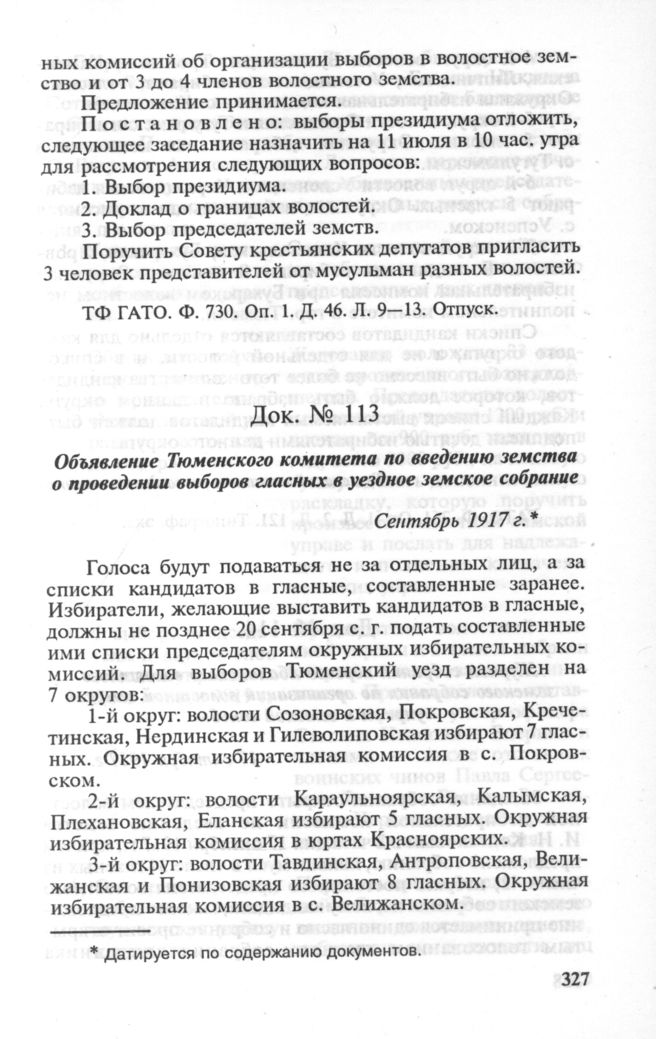 Объявление Тюменского комитета по введению земства о проведении выборов гласных в уездное земское собрание. Сентябрь 1917 г. // ГАТО. Ф. 261. Oп. 1. Д. 2. Л. 121. Типограф, экз.