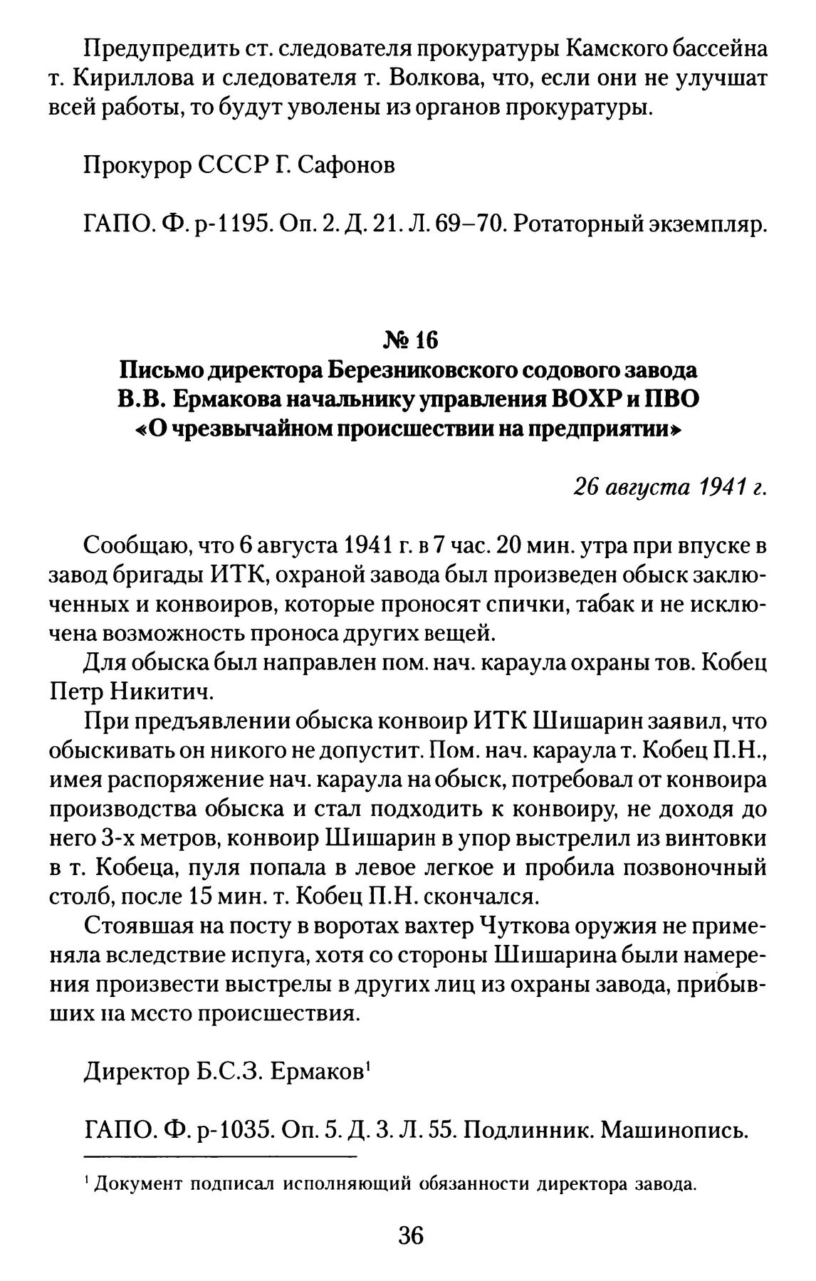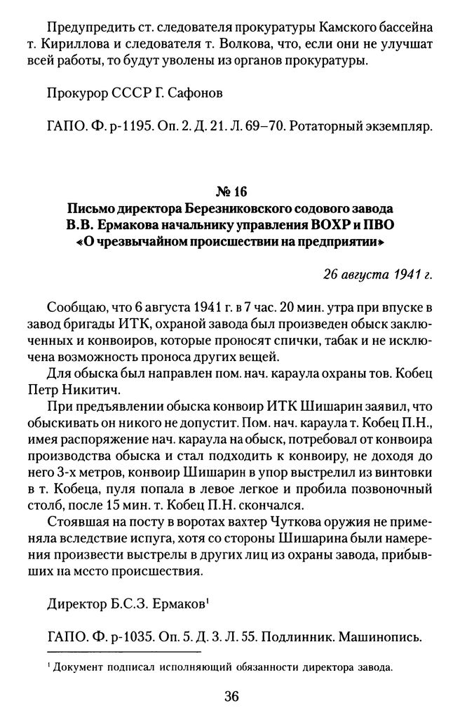 Письмо директора Березниковского содового завода В.В. Ермакова начальнику управления ВОХР и ПВО «О чрезвычайном происшествии на предприятии». 26 августа 1941 г. // ГАПО. Ф. р-1035. Оп. 5. Д. 3. Л. 55. Подлинник. Машинопись.