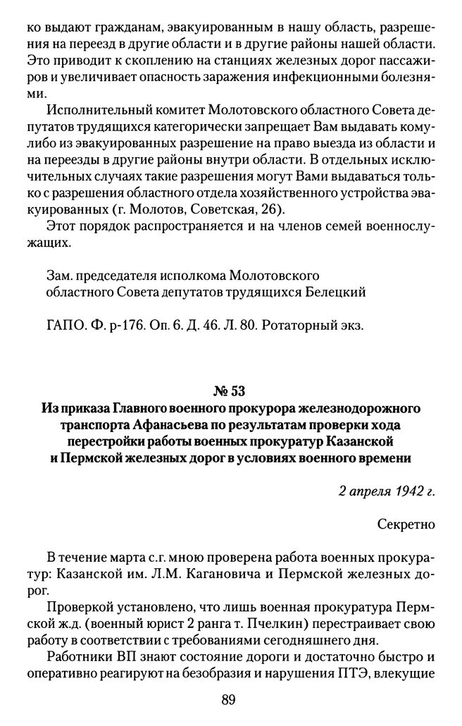 Из приказа Главного военного прокурора железнодорожного транспорта Афанасьева по результатам проверки хода перестройки работы военных прокуратур Казанской и Пермской железных дорог в условиях военного времени. 2 апреля 1942 г. // ГАПО. Ф. р-1198. Оп. 2. Д. 9. Л. 82,84. Копия. Машинопись.